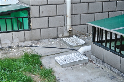 細看小區(qū)內的每棟樓房,磚紅色的墻壁上裝有白色的雨水管道,可以讓屋頂和外壁的雨水流下來。管道下端出口附近,有一塊鋪著白色鵝卵石的水泥體,中間低、兩邊高。北京建工集團的施工人員說,這是為了緩沖自上而下的雨水。水泥體旁邊不到10厘米就是綠化帶,雨水將會順著出口流入其中。